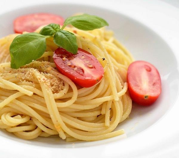wegańskie(2 porcje)- 2 ząbki czosnku, drobno pokrojone- ok. 6 łyżek dobrej jakości oliwy- ok. 200-220 g makaronu spaghetti (najlepiej z mąki durum)- do podania: pomidorki koktajlowe, świeże listki bazylii, nieaktywne płatki drożdżowe, świeżo zmielony pieprzMakaron gotuję al dente. Minutę przed końcem gotowania na patelni rozgrzewam oliwę i wrzucam na nią drobno pokrojony czosnek. Całość lekko solę i pieprzę. Uważam, by czosnek się nie przypalił.Gdy czosnek jest gotowy, zdejmuję patelnię z ognia. Wrzucam na nią odcedzony makaron, dokładnie mieszam i przekładam na talerze.Na makaron wrzucam przekrojone na pół pomidorki koktajlowe, całość stroję świeżymi listkami bazylii i posypuję nieaktywnymi płatkami drożdżowymi oraz świeżo zmielonym pieprzem.Prawda, że proste? :)