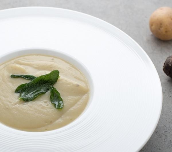 w egański, bezglutenowy(4-5 porcji)- 1 duża cebula (najlepiej cukrowa)- 2 ząbki czosnku- 600 g obranego topinamburu- 300 g kalafiora- ok. 100 g obranego selera- 2 małe ziemniaki- 1 l bulionu warzywnego- 1 łyżeczka świeżego rozmarynu- garść listków świeżej szałwii- szczypta cukru- sól, pieprz- olej ryżowyW głębokim garnku podgrzewam olej. Na niego wrzucam pokrojoną drobno cebulę. Gdy ta się zeszli dodaję poszatkowany czosnek i rozmaryn. Całość smażę ok. 2-3 min na mniejszym ogniu, co jakiś czas mieszając i uważając, by czosnek się nie przypalił.Wszystkie warzywa kroję w drobną kostkę i wrzucam do czosnku i cebuli, całość solę. Smażę ok. 5 min co jakiś czas mieszając. Następnie wlewam gorący bulion i całość zagotowuję.Gotuję pod przykryciem do miękkości warzyw (ok. 20 min). Miksuję zupę, doprawiam cukrem, solą i pieprzem do smaku. W razie gdyby zupa była dla nas zbyt gęsta - dolewamy szklankę przegotowanej, ciepłej wody.W międzyczasie na drugą patelnię wlewam olej ryżowy. Na zimny olej wkładam listki szałwii i całość podgrzewam. Listki szałwii smażę ok. 2 min z każdej ze stron. Usmażone wykładam na ręcznik papierowy, by pozbyć się nadmiaru tłuszczu.Gotową zupę nalewam do miseczek i ozdabiam usmażonymi liskami szałwii.Smacznego!