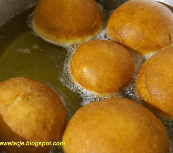 olejem. Smażymy pączki z obu stron, najpierw stroną, gdzie były sklejane - w dół. Gdy się zarumienią, patyczkiem do szaszłyków sprawdzamy czy są już gotowe. Żeby tłuszcz nie ciemniał, wrzucamy plasterek obranego, surowego
