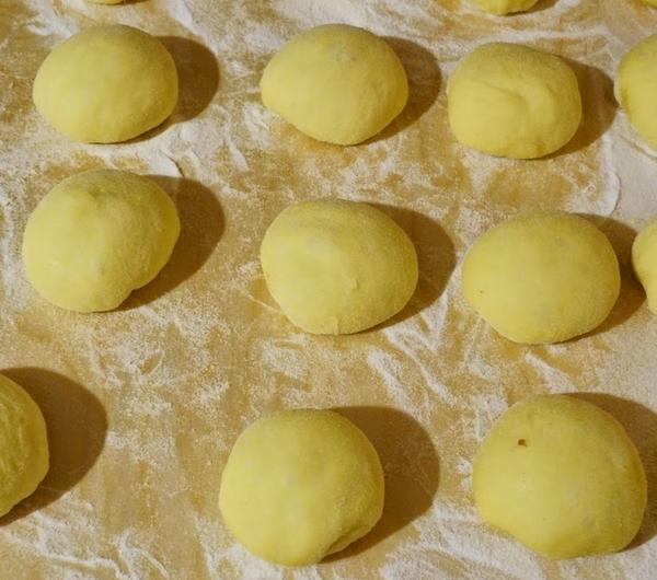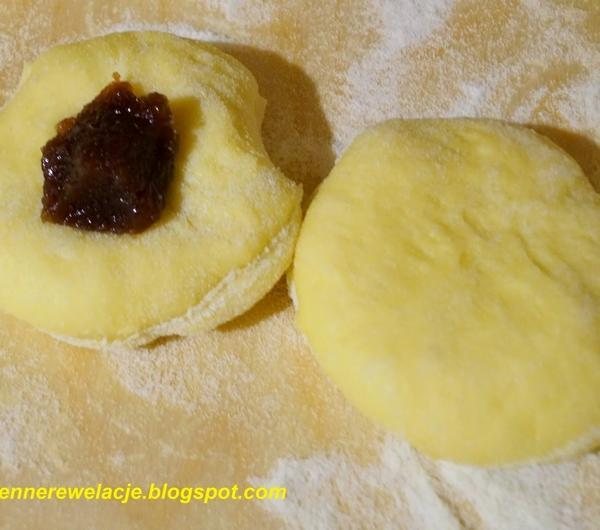 rumu. Kiedy ciasto przestanie kleić się do rąk, przykrywamy ściereczką i zostawiamy do wyrośnięcia. Gdy już wyrośnie urywamy po kawałku i rozwałkowujemy na grubość ok. 1,5 cm. Szklanką wykrawamy krążki, na których środek kładziemy łyżeczkę