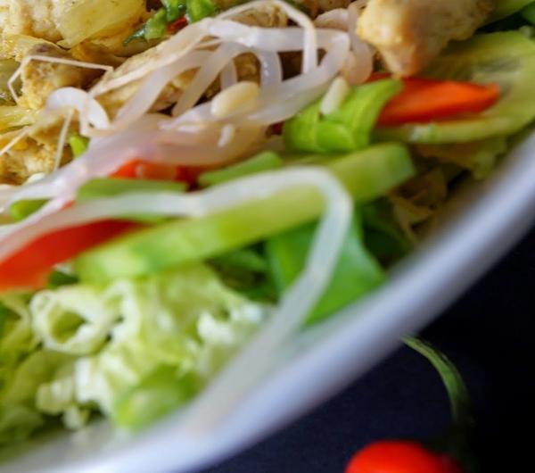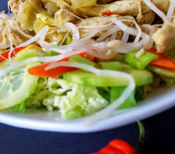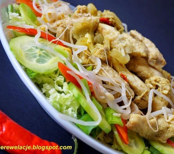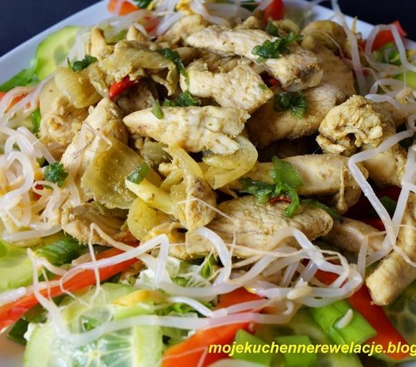PRZYGOTOWANIEOlej sezamowy rozgrzewamy w woku. Podsmażamy na złoto cebulę pokrojoną w piórka i czosnek przeciśnięty przez praskę. Dodajemy pastę curry i przesmażamy kilka minut razem. Dodajemy kurczaka pokrojonego w paseczki. Wlewamy sos rybny, dosypujemy cukier i curry. Smażymy do miękkości przez około 10 minut. Odstawiamy do ostudzenia. Dodajemy posiekane świeże zioła. Na półmisku układamy posiekaną kapustę, ogórka w plasterkach, paseczki czerwonej papryki. Dodajemy kurczaka z patelni, odsączone kiełki fasoli i posiekany szczypiorek. Smacznego :)