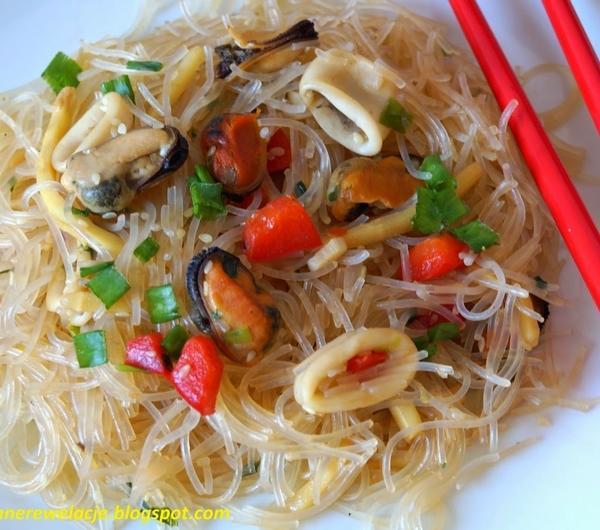sojowego, albo ryżowego1 cm imbiru2 dymki3 ząbki czosnku250 mieszanki owoców morzamała puszka pędów bambusa (225g)1 czerwona papryka2 łyżki białego sezamusos sojowysos rybnychili w proszkumasłoPRZYGOTOWANIEMakaron zalewamy wrzątkiem i odstawiamy na 5 minut, by zmiękł.W woku rozgrzewamy masło, na którym podsmażamy posiekane dymki, starty imbir i posiekany czosnek. Po kilku minutach dorzucamy owoce morza, 4 łyżki sosu sojowego i łyżkę sosu rybnego. Dorzucamy pokrojoną w kostkę paprykę, odcedzone pędy bambusa i sezam. Przyprawiamy szczyptą chili. Smażymy kilka minut,,aż owoce morze będą miękkie. Dorzucamy makaron i mieszamy. Smacznego :)