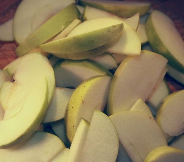 Następnie pieczemy 15 minut w temperaturze 180 stopni. Ciasto wkładamy na środkową szynę, ale na górze włożyłam blachę, tak aby dół by ł bardziej upieczony ale nie spieczony.W tym czasie starannie myjemy jabłka które użyjemy do dekoracji. W domu nie miałam czerwonych jabłek, użyłam zielonych, na pewno czerwone wyglądałyby lepiej. Jabłka kroimy na ćwiartki, wycinamy gniazda nasienne, każdą ćwiartkę kroimy w plastry o szerokości 5-7 mm. Na ś rodek do dekoracji kroimy dwa jabłka w kształcie serca.