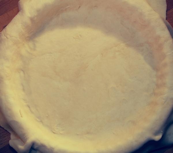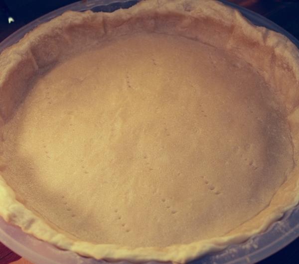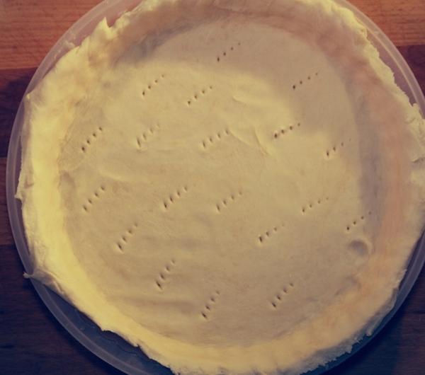Formę do tarty smarujemy masłem od środka. Ja użyłam formy silikonowej i nie smarowałam formy. Teraz wyjmujemy schłodzone ciasto z lodówki i delikatnie rozwałkowujemy z obu stron na blacie posypanym mąką (rozwałkowane ciasto musi byc nieco większe niż średnica formy). Formę wykładamy ciastem, które dokładnie dociskamy do dna i brzegów formy. Spód ciasta nakłuwamy widelcem. Za pomocą noża usuwamy nadmiar ciasta.