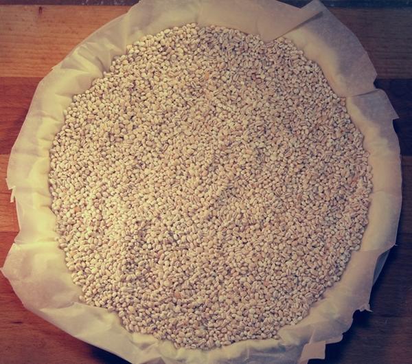 Przykrywamy pergaminem i obciążamy suchymi ziarnami fasoli. Ja akurat w domu nie miałam fasoli przykryłam jęczmieniem.