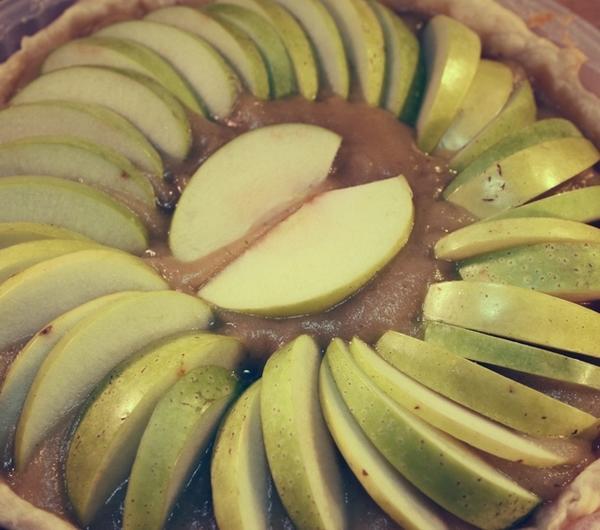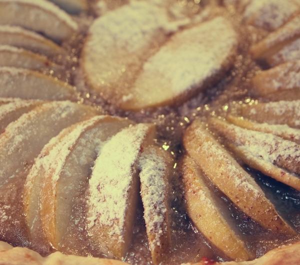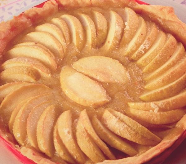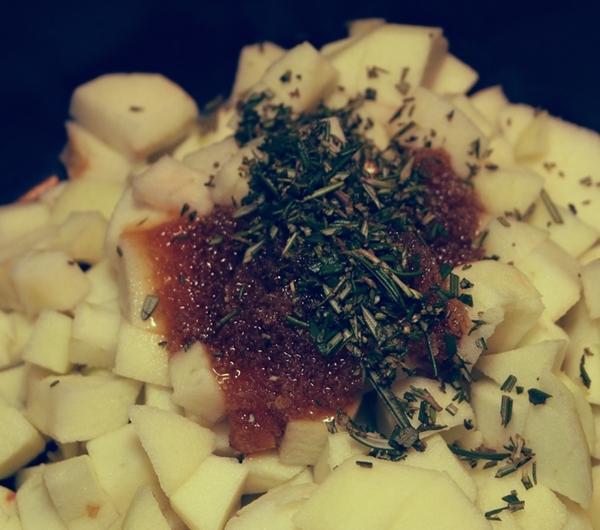 Składniki :Na ciasto brisée:250 g mąki130 g masła100 ml wodyNa pure z jabłek:4 złote jabłka2 łyżki miodu2 gałązki rozmarynuDo udekorowania:cukier do smakucukier puder do smaku2 czerwone jabłkamasło roztopione do smarowaniaPrzygotowanie:Do miski miksera, który wrabia ciasto wsypujemy mąkę, dodajemy zimne masło pokrojone na kawałki, szczyptę soli oraz lodowatą wodę i zaczynamy wyrabiać maszynką. Wyrabiamy na elastyczną masę. Jeśli będzie zbyt suche, dodajemy troszeczkę lodowatej wody, ale dolewaj ją raczej małymi porcjami, po łyżce. W sumie ja wlałam 100 ml wody. Gdy zagniatane ciasto zbije się w kulę, starannie owijamy je folią do przechowywania żywności i wkładamy do lodówki na 60 minut. Tymczasem przygotowujemy nadzienie.W międzyczasie starannie myjemy jabłka i obieramy. Kroimy w kostkę, a następnie umieszczamy je w garnku z miodem i rozmarynem, który został wcześniej posiekany na drobn o .
