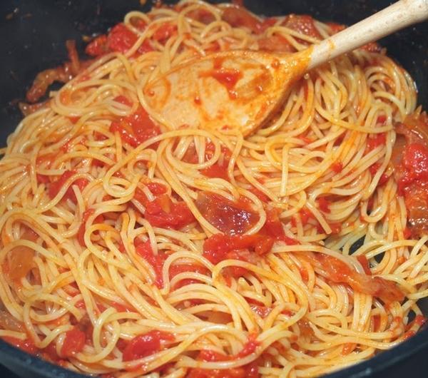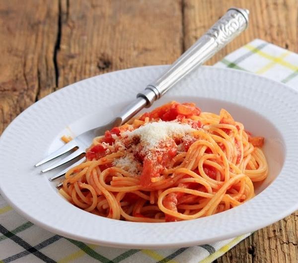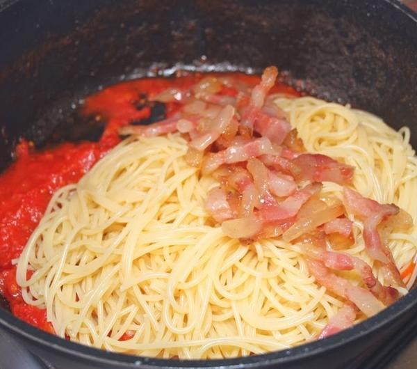 makaron. Jak jesteście w Rzymie znajdziecie bucatini all'Amatriciana a nie spaghetti.Zapraszam Was na te spaghetti all'Amatricina, które moim zdaniem najbardziej odzwierciedlają oryginał przepisu miasta Amatrice.