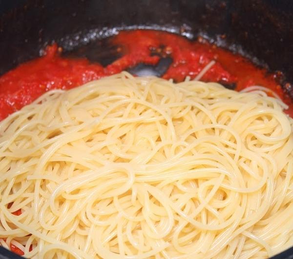 Tymczasem, gotujemy w osolonej wodzie spaghetti. Odcedzamy i wlewamy bezpośrednio do rondla,