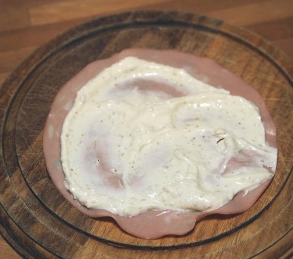 Każdy plasterek mortadelli smarujemy farszem.