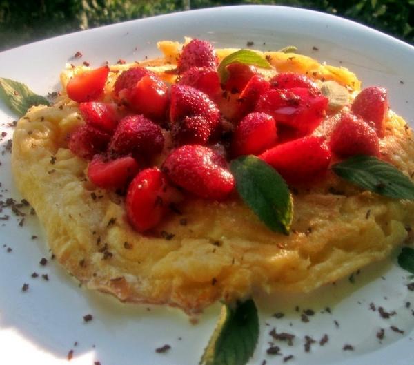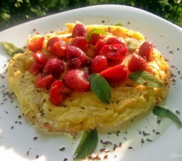 masła i wlać masę omletową. Gdy boki będą się lekko ścinać, łyżką podważać ściętą masę w kierunku środka patelni, jednocześnie przelewaając jeszcze tę nie ściętą jej środka na boki. Na koniec przykryć pokrywką i smażyć jeszcze około 2-3 minuty.Wyjać na talerz, lekko przestudzić. Polać słodką