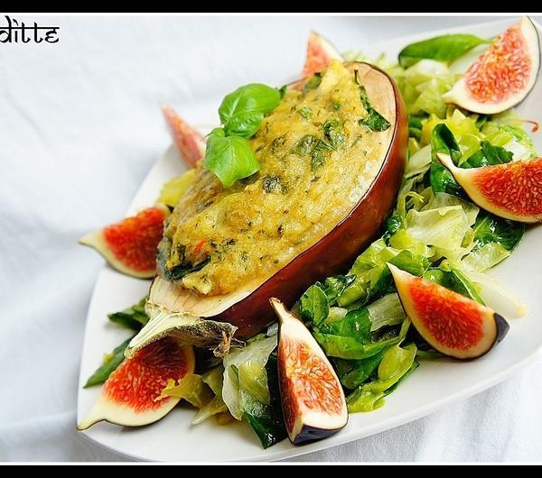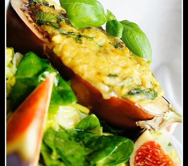 Składniki:1 bakłażan1 cukinia3 ząbki czosnku1 natka pietruszkigarść listków bazyliigarść świeżego młodego szpinaku1 łyżka oliwy z oliwekpieprzszczypta soli1 łyżka syropu z granatów2 figi - miąższPrzygotowanie:Warzywa myjemy.Bakłażana przekrawamy na pół i wydrążamy miąższ tak aby powstały nam dwie miseczki bakłażanowe.Cukinię wraz ze skórką kroimy na kosteczkę. Siekamy czosnek. Warzywa wraz z resztą składników wrzucamy na rozgrzaną patelnię z oliwą i smażymy. Następnie wszystko blendujemy. Wypełniamy miseczki z bakłażana i wkładamy do rozgrzanego piekarnika. 180 stopni góra i dół. Pieczemy około 40 minut.Gotowe :)Smacznego !!!!