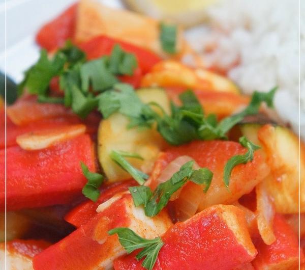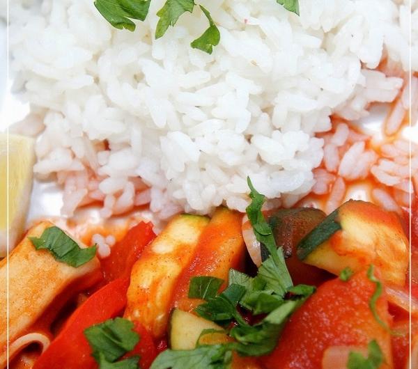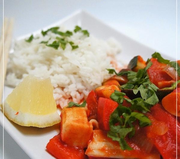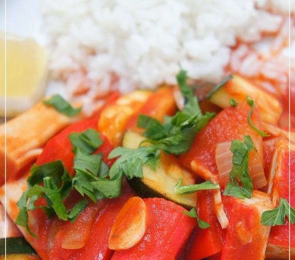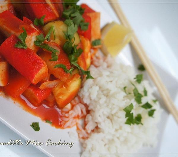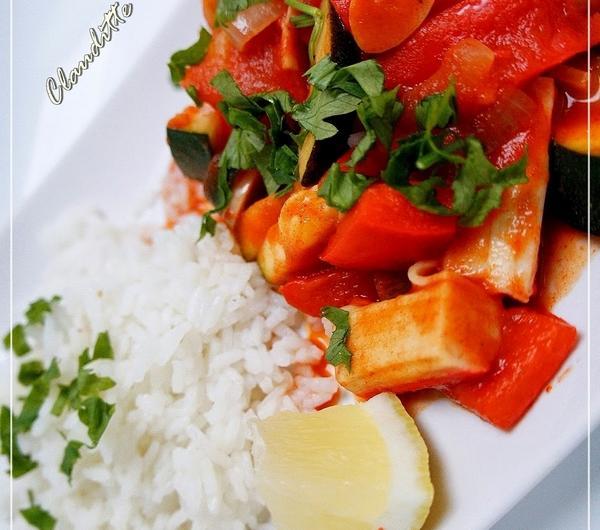 Moje Smaki Życia --> strona 49 --> numer 7 Lipiec --> KLIKSkładniki:2 woreczki ryżu białego długoziarnistego Supreme2 opakowania paluszków surimi Marineoananas Sanello (to co zostało po hamburgerach)1 opakowanie przecieru pomidorowego Sottile Gustoczosnek 6 ząbków (w gazecie proponują 4 ząbki)2 czerwone papryki (w gazecie proponują 1 sztukę)2 łyżki oliwy z oliwek (w gazecie proponują olej rzepakowy)natka pietruszki1/4 cytryny1 łyżka przyprawypapryka ostra mielona Prymatzalewa z ananasa Sanelloja dodałam dodatkowo:1 cukiniasok z 1/2 cytryny1 cebulaPrzygotowanie:Ryż gotujemy wedle zaleceń producenta, płuczemy i posypujemy posiekana natka pietruszki.Paluszki surimi przecinamy na pół. Paprykę pokroiłam w dużą kostkę jak również ananasa, cebulę i cukinię. Dodajemy zawartość na rozgrzaną oliwę w głębokiej patelni. Dusimy pod przykryciem na średnim ogniu. Przecier przelewamy do miski, dodajemy do niego zalewę z ananasa, sok z cytryny, posiekany czosnek i mieloną paprykę. gdy warzywa na patelni zmiękną dodajemy do nich sos. Mieszamy i pod przykryciem na małym ogniu dusimy jakieś 20 minut. GOTOWE !!!