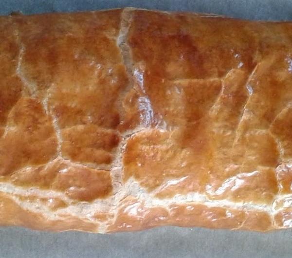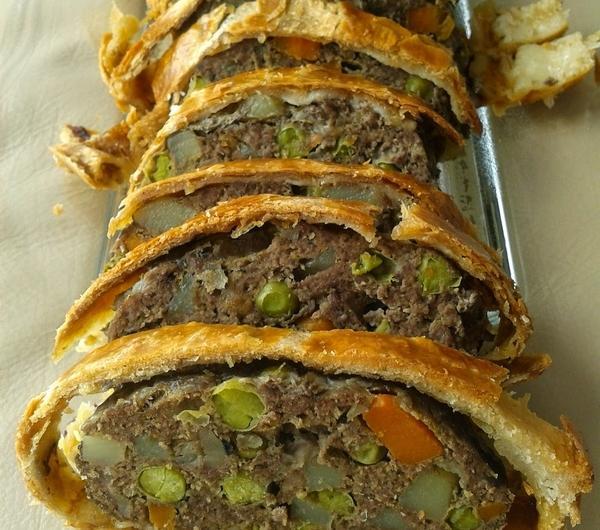 Mięso umyć i zemleć. Obrać i pokroić cebulę, marchewkę i ziemniaka w średnią kostkę. Przecisnąć czosnek przez praskę. Oczyścić i pokroić pieczarki, by były mniej więcej takiej samej wielkości jak pozostałe warzywa. Postawić dużą patelnię na średnim ogniu, wlać oliwę i wrzucić wszystkie warzywa, dodać zioła prowansalskie. Smażyć i mieszać przez około 8 minut, aż warzywa zmiękną. Dodać mrożony groszek. Smażyć jeszcze około 3 minut. Usmażone warzywa przełożyć do dużej miski i pozostawić do wystudzenia. Po tym czasie jajko wbić do innej miseczki i rozmieszać. Do miski, w której znajdują się warzywa dodać mięso, sporą szczyptę soli i pieprzu oraz 3/4 jajka. Zagnieść i wymieszać całość - najlepiej czystymi dłońmi lub drewnianą łyżką.Ciasto rozłożyć na papierze do pieczenia, na dłuższy brzeg ciasta układać farsz i formować tak, aby uzyskać długi i równy kształt. Zawinąć mięso w cieście. Pędzelkiem zamoczonym w jajku posmarować całość. Piec w rozgrzanym wcześniej do 175/180st. piekarniku przez godzinę.