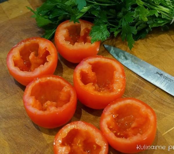 Pomidory myjemy i odcinamy górną część, odkładając ja na bok.