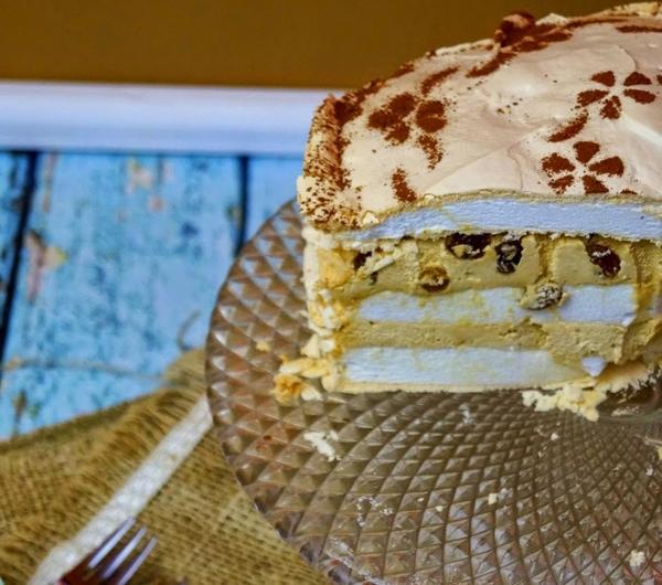 Tort bezowy z kawowym krememProporcje na tortownicę o średnicy 20 cmCzas przygotowania: 5 godzinSkładniki na 3 blaty:6 białek300 g drobnego cukru do wypiekówszczypta soli1 łyżeczka octu250 ml zimnej śmietanki 30 %250 ml mascarpone2 łyżki cukru pudru4 łyżeczki kawy rozpuszczalnej2 łyżki wrzątku1/3 szklanki rodzynekkoniak lub whisky do moczenia rodzynek