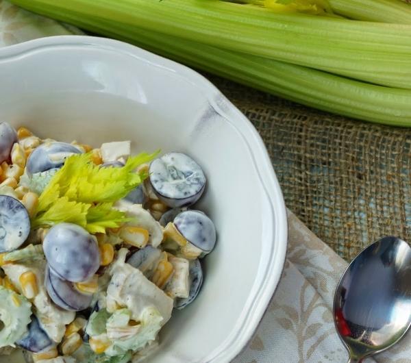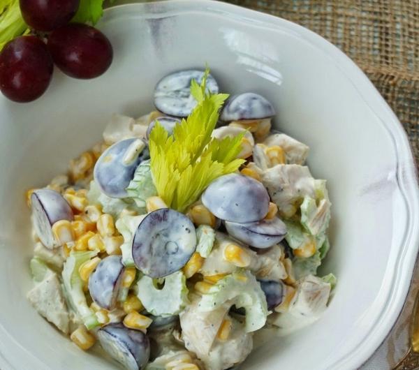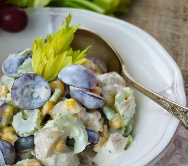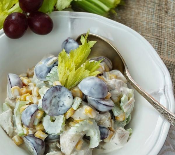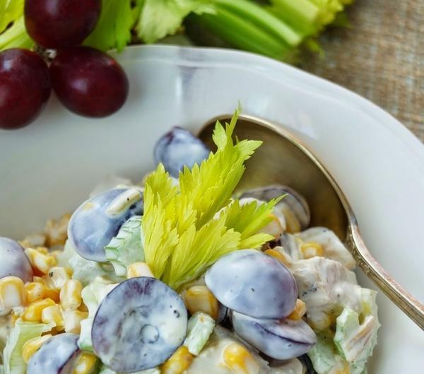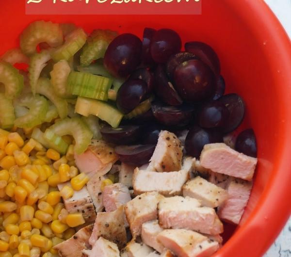 Proporcje dla 6 osóbCzas przygotowania : 45 minutSkładniki:1 duża pierś z kurczaka300 g ciemnych winogron1 puszka kukurydzy3 łodyżki selera naciowegosok z cytryny2 łyżki majonezu3 łyżki jogurtu typu greckiegosól morskapieprzolej do smażenia