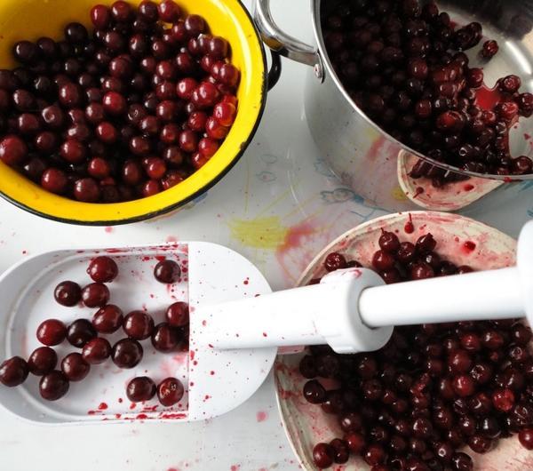 Wiśnie myjemy i drylujemy. Umieszczamy w dużym garnku, dodajemy sok i skórkę z