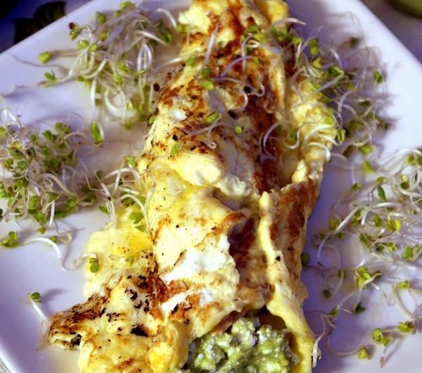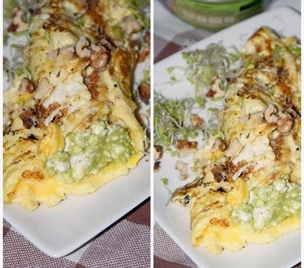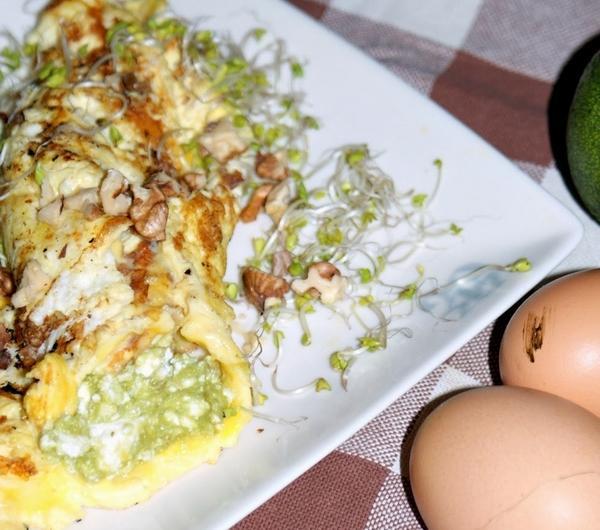 2 jajkamasło klarowneawokadołyżka soku z cytryny lub limonkiząbek czosnku1-2 łyżeczki pikantnego sosu tabasco2 łyżki twarogu chudego6 orzechów włoskichopcjonalnie: kiełki brokułaZaczynamy od guacamole. Rozgnieć awokado i twaróg za pomocą widelca. Dodaj sok z cytryny, sos tabasco i czosnek przeciśnięty przez praskę. Dokładnie wymieszaj.Na patelni rozgrzej masło klarowne. W kubku rozmieszaj jajka i wylej na na rozgrzaną patelnię. Smaż ok. 2 minuty na wolnym ogniu. Wyłącz ogień. Na środku omletu wyłóż guacamole, złóż go na pół i przełóż na talerz. Udekoruj posiekanymi orzechami włoskimi i kiełkami brokuła.