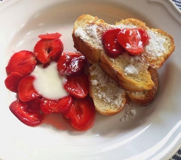 Pain perdu (french toast) jest jednym z najstarszych deserów swiata. Pierwsze wzmianki o tym przysmaku pojawiają sie juz w łacińskich książkach z IV i V wieku!Potrawa ta nie występuje jednak tylko jako deser, lecz także jako sniadanie! Jest to idealny pomysł na pyszny, poranny posiłek i najlepiej smakuje w połączeniu z sezonowymi owocami!100 g chałki1 jajkoCukier puder60 g truskawekSok z 1/2 limonki50 g miodu20 g kwaśnej śmietany20 ml syropu klonowegoNa średnio rozgrzanej patelni usmaż obtoczone w roztrzepanym jajku 2 kromki chałki Posyp cukrem pudrem przed podaniem Truskawki pokrój na plasterki Podgrzej w rondelku miód z sokiem z limonki i dodaj truskawki Ułóż wszystko na talerzu i podawaj z łyżką kwaśnej śmietany i syropem klonowym