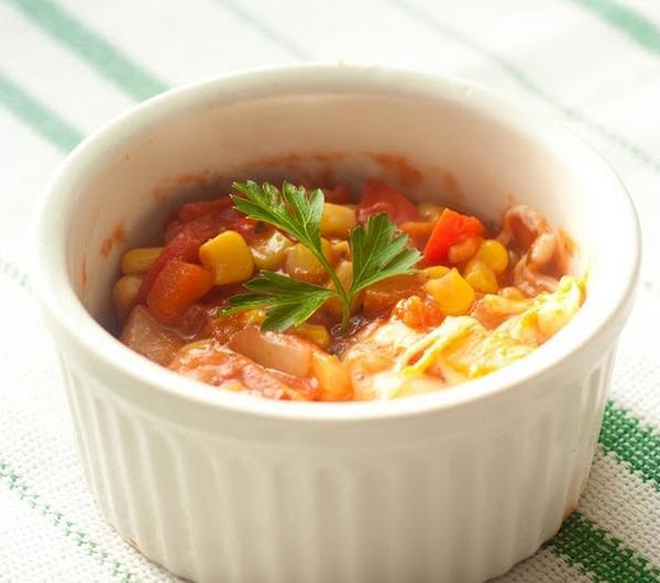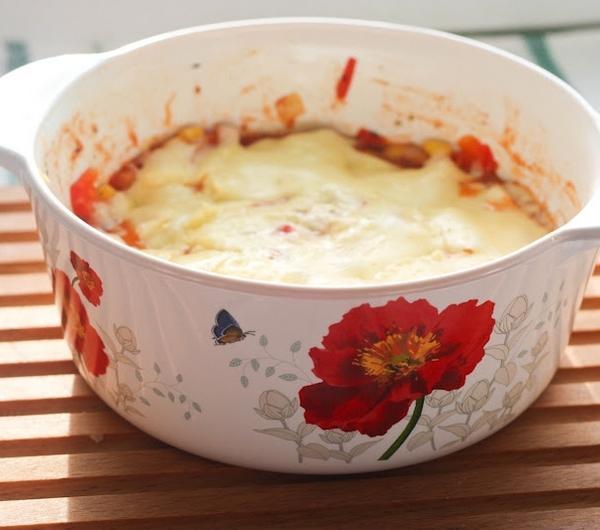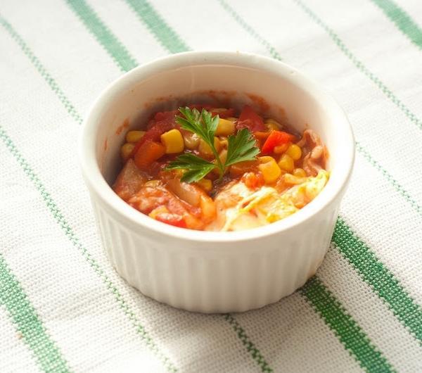 papryka czerwona2 pomidorycebula2 ząbki czosnkupół puszki ananasapół puszki kukurydzy2 łyżki koncentratu pomidorowego3 łyżki oleju z pestek winogron10 dag serapół łyżeczki suszonego tymiankupół łyżeczki oreganosól, pieprznatka pietruszkiCebulę pokroić w kosteczkę.Czosnek przecisnąć przez praskę.Włożyć do garnuszka z rozgrzanym olejem.Smażyć chwilę.Paprykę pokroić w kostkę i wrzucić do cebulki z czosnkiem.Dodać pomidory pokrojone w kostkę.Wsypać przyprawy i wlać koncentrat.Czekać aż warzywa lekko zmiękną i dodać wtedy pokrojonego ananasa.Na sam koniec dodać kukurydzę.Zdjąć garnuszek z ognia.Pokroić ser w plastry grube i przykryć nim warzywa.Zapiekać przez chwilę w nagrzanym piekarniku do 180st.C( lub w mikrofalówce przez 3min.) do momentu aż się rozpuści ser.Podawać w miseczkach małych z natką pietruszki.
