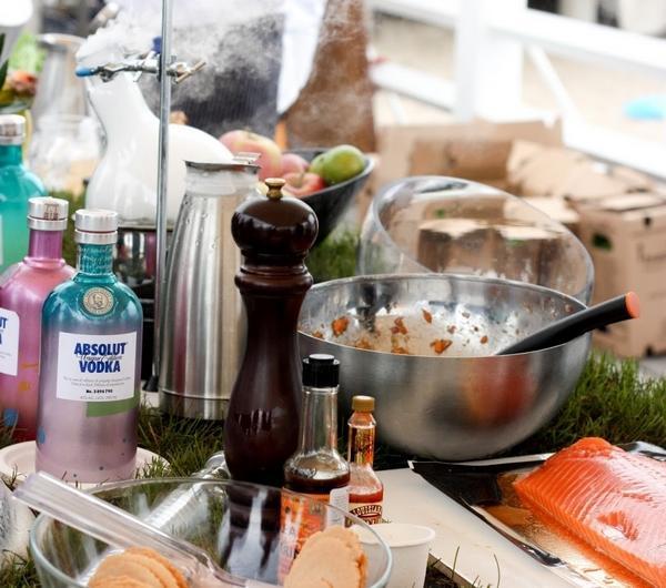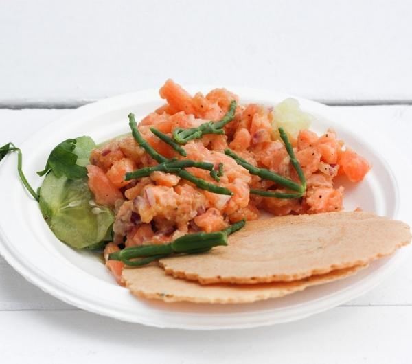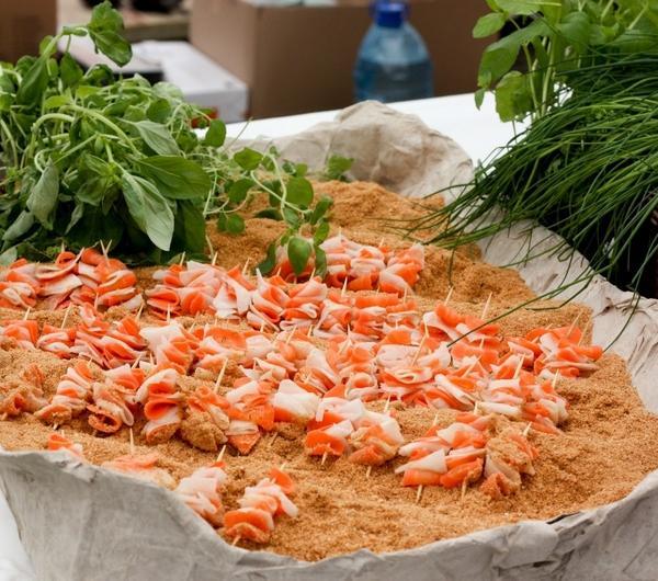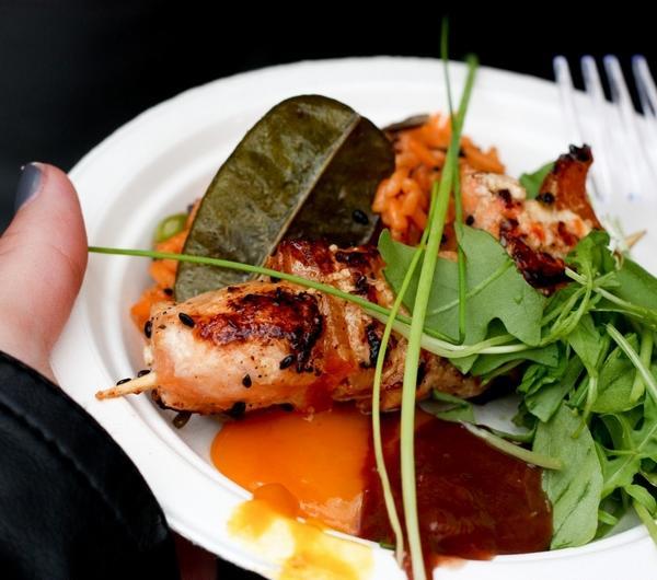 Rewelacyjny szaszłyk z łososia z chutneyem z tamarandynowca i rabarbaru (Rucola?)