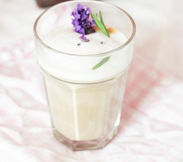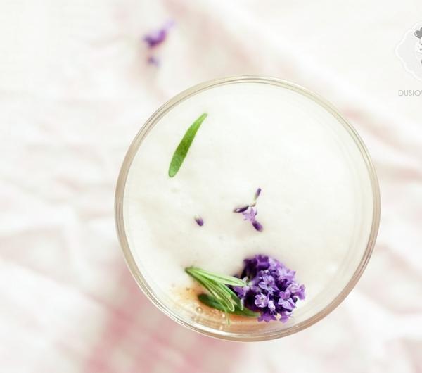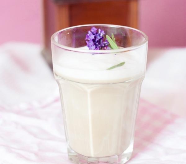 łyżeczka rozpuszczalnej kawyłyżeczka cukru lawendowego (przepis)pół szklanki gorącej wodypół szklanki ciepłego mlekagałązka z kwiatami lawendyKawę z cukrem lawendowym zalać gorącą wodą.W oddzielnej szklance lub kubku wlać ciepłe spienione mleko (można użyć shakera, spieniacza do mleka, albo potrząsać mleko w zamkniętej butelce).Delikatnie strużką dolewać kawę do mleka.Wrzucić gałązkę lawendy.
