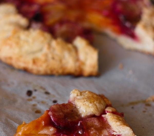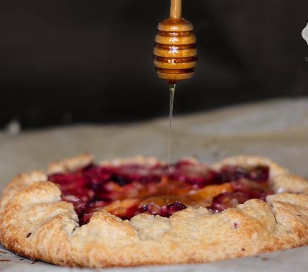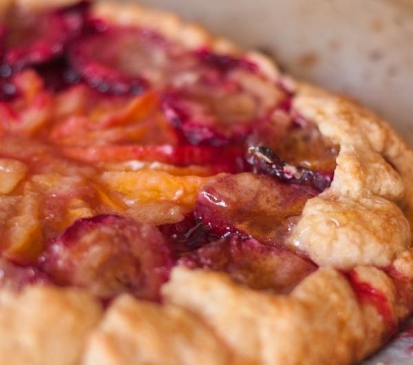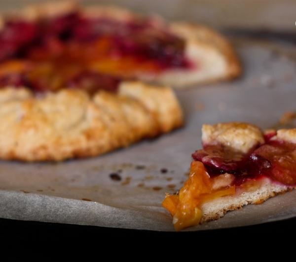 ciasto :1,5 szklanki mąki orkiszowej jasnejpół kostki masła3 łyżki cukru pudruszczypta soliłyżeczka cynamonu5 łyżek zimnej wodydodatki :2 brzoskwiniekilkanaście śliwek2 łyżki cukru1,5 łyżki mąki ziemniaczanejłyżeczka cynamonu2 łyżki mlekamiódWszystkie składniki na ciasto zagnieść ze sobą.Uformować kulę, włożyć do woreczka i schłodzić w lodówce przez 30 minut.Brzoskwinie sparzyć wrzątkiem, a potem obrać ze skórki, usunąć pestki i pokroić na plasterki.Śliwki przekroić na pół i usunąć pestki.W szklance wymieszać cukier z mąką ziemniaczaną i cynamonem.Ciasto rozwałkować na koło o średnicy około 30 cm i przenieść na blachę wyłożoną papierem do pieczeniem.Każde z owoców obtaczać z dwóch stron w mieszance cukru, cynamonu i mąki ziemniaczanej.Układać na środku ciastka brzoskwinie, na zewnątrz robić okręgi ze śliwek-pamiętając by zostawić około 3 cm ciasta od zewnątrz.Zawinąć wolne boki ciasta do środka, posmarować je mlekiem.Piec przez 50 minut w temp. 190 st.C.Po wyjęciu polać owoce miodem, który można zastąpić np. konfiturą.