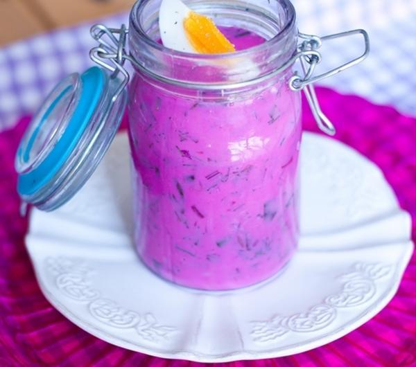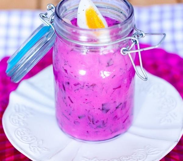 pęczek botwinki z małymi buraczkamipęczek rzodkiewek2 świeże ogórki0,5 l wody500 ml zsiadłego mleka/kefiru500 ml maślankisok z połowy cytrynysól, pieprzłyżeczka cukruszczypiorek/koperekokoło 150 g szynki konserwowejdo podania: jajko na twardoW garnku zagotować wodę, potem dodać posiekane drobno buraczki z łodyżkami, a po jakimś czasie liście botwinki oraz sok z cytryny.Wystudzić i dodać następnie starte na tarce drobno rzodkiewki i ogórki.Dolać zsiadłe mleko lub kefir oraz maślankę, wymieszać i doprawić do smaku solą, pieprzem i dodać łyżeczkę cukru.Na koniec wmieszać pokrojoną drobno szynkę konserwową oraz posiekany szczypiorek i koperek.Podawać schłodzone z ugotowanym jajkiem na twardo.