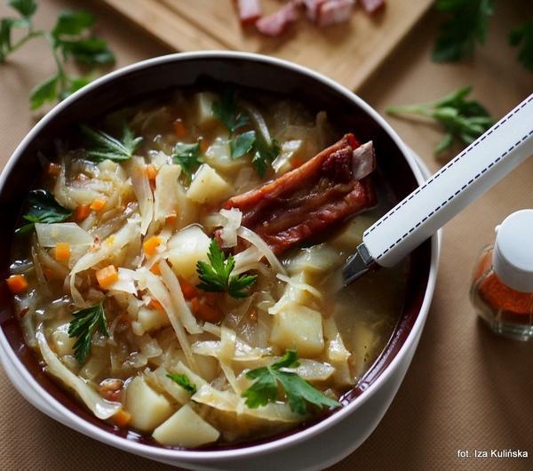 Wszystkie warzywa oczyściłam i obrałam. Kapustę pokroiłam w paski, marchewkę i pietruszkę w drobną kostkę a ziemniaki z większą. Kiedy żeberka się ugotowały wyjęłam je z wywaru a do garnka wrzuciłam kapustę, ziemniaki, marchew i pietruszkę. Dolałam gorącej wody, tyle żeby przykrywałam warzywa. Gotowałam ok. 15 minut aż zmiękły. Pod koniec dosypałam trochę domowej przyprawy warzywnej.Jak ugotować Kapuśniak na warkoczu ?Na tę samą patelnię, na której obsmażałam kawałki żeberek, wrzuciłam drobno pokrojony kawałek wędzonki. Zrumieniłam. Dodałam pokrojoną w kosteczkę cebulę i smażyłam razem kilka chwil aż zaczęła zmieniać kolor. Oprószyłam całość mąką, wymieszałam dokładnie aż obtoczyłam wszystkie kawałeczki. Przełożyłam do garnka z ugotowanymi warzywami. Doprawiłam zupę kminkiem, pieprzem i solą. Wcześniej wyjęte żeberka włożyłam z powrotem zupy żeby się ponownie zagrzały.Po ugotowaniu dobrze jest zupę odstawić na 20-30 minut żeby smaki się przygryzły i dopiero podawać.