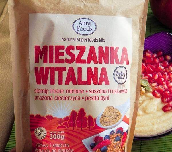 Składniki:siemię lniane mielone, suszona truskawka, prażona ciecierzyca, pestki dyni.Mieszanka Witalna to opracowana przez specjalistów kompozycja Superfoods : pełnowartościowej żywności o wysokiej zawartości substancji odżywczych oraz rozpływających się w ustach suszonych owoców. Dostarcza niezbędnych substancji odżywczych tj. białka, aminokwasów, nienasyconych kwasów tłuszczowych, zdrowych węglowodanów, witamin i minerałów.Jest szczególnie polecana zapracowanym osobom, którym ciężko znaleźć czas na jedzenie, a także osobom aktywnym fizycznie lub przebywającym na diecie odchudzającej, bezglutenowej, wegańskiej, wegetariańskiej oraz tym, których dieta jest uboga w warzywa i owoce lub przeciwnie - tym, którzy starannie wybierają zdrową żywność najwyższej jakości.100% NATURALNE SKŁADNIKISiemię lniane – to główny składnik Mieszanki Witalnej i jedno z najbogatszych źródeł niezbędnych nienasyconych kwasów tłuszczowych Omega-3. Zawiera łatwo przyswajalne białko, błonnik, żelazo, witaminę E i kwas alfa-linolenowy, pomocny w walce z wysokim poziomem złego cholesterolu.Suszona truskawka – miękkie i naturalnie słodkie suszone owoce truskawki zaskakują smakiem i wpływają pozytywnie na trawienie. Ten składnik najbardziej mi posmakował!Prażona ciecierzyca – już mała ilość tych chrupiących ziarenek zapewnia uczucie sytości na długi czas. To również bogate źródło białka i błonnika.Łuskane pestki dyni – wyjątkowo smaczne i pożywne źródło witamin i minerałów.