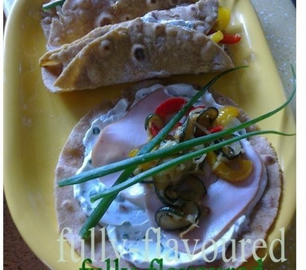 Farsz:· 1 łyżka oliwy spod suszonych pomidorów· 1 papryka żółta· 1 papryka czerwona· 1 cebula· 1 ząbek czosnku· 1 cukinia· kilka plasterków szynki z indyka· 400 gram serka Philadelphia- solonego· 2 garście drobno posiekanego szczypiorku· sól i pieprz do smakuNa rozgrzaną łyżkę aromatyzowanej oliwy dajemy posiekaną w piórka cebulę oraz drobno posiekany czosnek. Dodajemy pokrojoną w drobne paseczki paprykę żółtą i czerwoną oraz cukinię pokrojoną w cienkie plasterki. Smażymy do miękkości, doprawiamy solą i pieprzem.Serek łączymy ze szczypiorkiem, doprawiamy do smaku solą i pieprzem.Placek tortilli smarujemy szczypiorkowym serkiem, kładziemy dwa plasterki szynki z indyka, na to dużą porcję warzyw. Zwijamy i zajadamy. Smacznego!