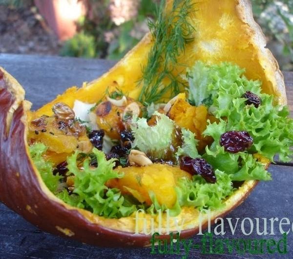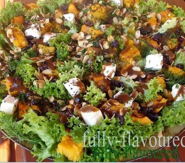 Składniki:· połowa dużej dyni· główka ulubionej sałaty- ja wybrałam postrzępioną, gdyż ładnie się prezentuje na talerzu· 100 g suszonej żurawiny· garść podprażonych na suchej patelni płatków migdałowych· garść podprażonego na suchej patelni czarnego sezamu
