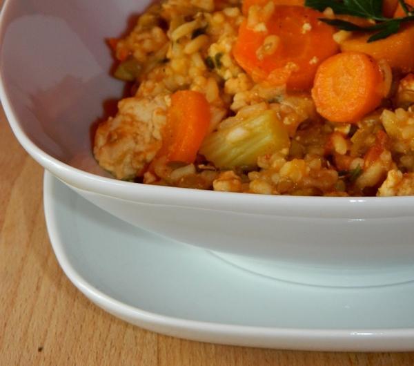 Mięsko z indyka płuczemy. Mielimy je i doprawiamy solą, pieprzem oraz papryką słodką. W woku rozgrzewamy 2 łyżki oliwy z oliwek. Wrzucamy na rozgrzaną oliwę (porcjami) mięso i smażymy je na złoty kolor. Do indyka wsypujemy odcedzony ryż, mieszamy i smażymy razem przez minutę, co chwilę mieszając. Dodajemy pokrojoną w kosteczkę czerwoną paprykę, ugotowaną soczewicę, sos pomidorowy oraz bulion warzywny razem z warzywami. Mieszamy wszystko delikatnie drewnianą łyżką. Przykrywamy woka pokrywką i dusimy naszą potrawę około 20 minut (ryż musi spęcznieć).