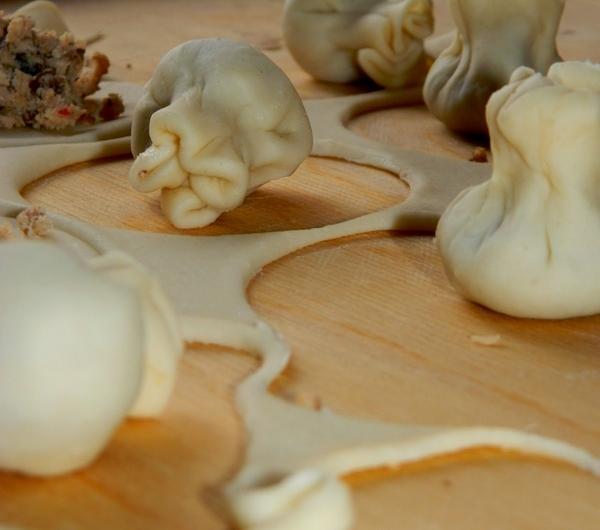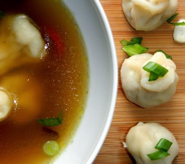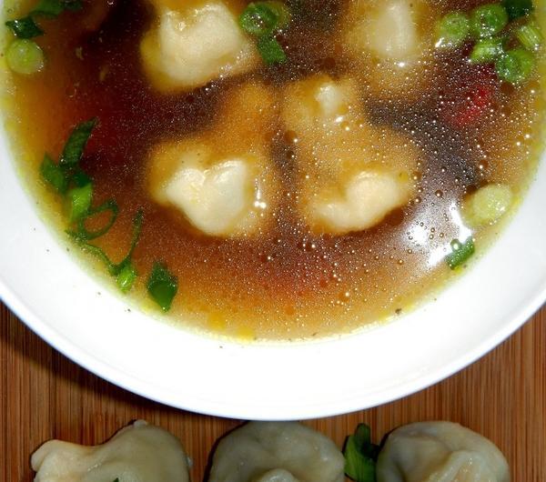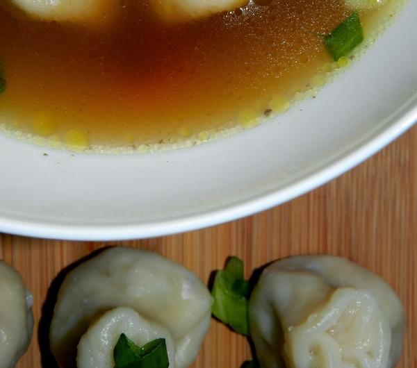 wodę. Chwilę mieszamy składniki łyżką, by wstępnie się połączyły, a następnie zagniatamy je energicznie (ostrożnie, bo gorące!). Ciasto wrabiamy około 5 minut - powinno łatwo odchodzić od stolnicy i rąk. Formujemy z niego kulę, którą przykrywamy szmatką i odstawiamy na chwilę, by ciasto odpoczęło. Po około 15 minutach rozwałkowujemy ciasto na bardzo cieniutki placek (im cieńszy, tym lepszy). Za pomocą szklanki wykrawamy kółka. Na środek każdego placka nakładamy farsz i zlepiamy brzegi na kształt sakiewki. Gotowe pierożki gotujemy w lekko osolonej wodzie (gdy wypłyną gotujemy je jeszcze 4 minuty). Przekładamy je do miseczki, zalewamy zupą i oprószamy posiekaną