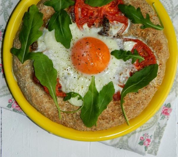 otrębów). Pizzę można podawać z najróżniejszymi dodatkami. Ja wykorzystałam akurat to, co znajdowało się w mojej lodówce i wymagało szybkiego zużycia. Przygotowanie takiego śniadania nie zajmie więcej, niż 20 minut (ciasto od razu po zarobieniu możemy wstawić do piekarnika).Składniki (4 porcje):ciasto15 g