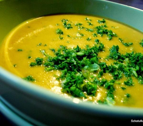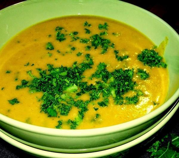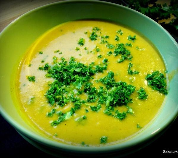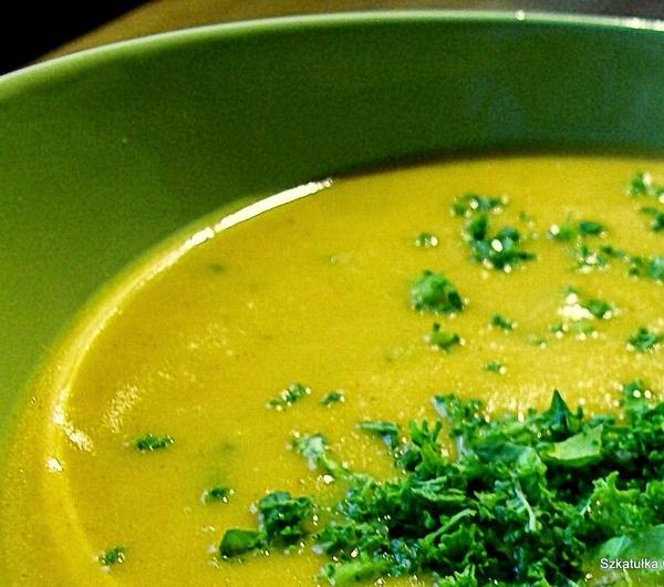 Zupę podajemy posypaną zieleniną – ja posypuję ją drobno posiekanym jarmużem i pietruszką.