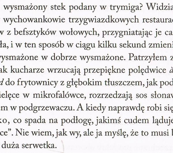 Jesteście gotowi na ostrą kulinarna jazdę bez trzymanki? Anthony Bourdain zabije Was śmiechem, rozbroi szczerością i opowie takie rzeczy o szefach kuchni, o jakich wam się nie śniło.Od pierwszej strony wiedziałam, że to będzie książka, przy której jak nic popłaczę się ze śmiechu. Ba, nawet wcześniej niż od pierwszej strony. Wzięłam książkę do ręki, otworzyłam na chybił-trafił, a tam: Zasada pierwsza: uciekaj z hotelu najdalej, jak to możliwe. Zasada druga: unikaj miejsc, gdzie zbierają się tacy jak ty (to znaczy przyjezdni i turyści). Zasada trzecia: gdy znajdziesz nędzny bar wypchany po brzegi tubylcami, którzy najwyraźniej dobrze się bawią, wejdź, usiądź i zacznij pić. Już pana lubię, panie Bourdain.Później jest już coraz lepiej. Jeśli myślicie, że tylko Bear Grylls zjada robaki na śniadanie, jesteście w błędzie. Bourdain robi to z nie mniejszą gracją. W końcu szkolił się w CIA (jak przystało na CIA, dla niepoznaki: Culinary Institute of America) i choć dziecięce plany zostania sławnym gangsterem albo wyjętym spod prawa kryminalistą spełzły na niczym (zbyt ciężka praca), Anthony nie zrezygnował z bezwzględnej ironii, bluzgania na lewo i prawo, zabijania błyskotliwym poczuciem humoru i wyzłośliwiania się na połowę kulinarnego świata. Fucha byłego szefa kuchni, obecnie kręcącego swój własny program podróżniczo-kulinarny Anthony Burdain: No reservations obejmuje, obok zajadania się smakołykami w najodleglejszych zakątkach świata i popijania ich miejscowymi alkoholami, takie uciechy, jak picie wódki ryżowej ramię w ramię z kambodżańskimi partyzantami, wgryzanie się w ugotowane, usmażone albo zapieczone w karmelu i nabite na patyczki pełzająco-bzykające rarytasy.Jeśli spodziewacie się grzecznych tekstów o jedzeniu w stylu "och, co jest delikatniejsze: przegrzebki czy fois gras?", czeka was rozczarowanie. Bourdain, zamiast tracić czas na takie rozważania, serwuje opowieści z kuchennego piekła rodem. Co dzieje się na zapleczu miłych, acz z jakiegoś powodu świecących pustakami barów? Dlaczego odpadnięte literki z neonu z nazwą restauracji są jak wielki, czerwony znak STOP krzyczący: "omijaj to miejsce z daleka!" I jak naprawdę wygląda wieczór w restauracji - ale nie z punktu widzenia gości, którzy niecierpliwią się, że zamiast 6 minut, na zamówione dania przyszło im czekać 8, ale z perspektywy szefów kuchni, kucharzy i kelnerów, którzy uwijają się jak w ukropie, próbując skoordynować swoje ruchy jak primabaleriny w rosyjskim balecie.