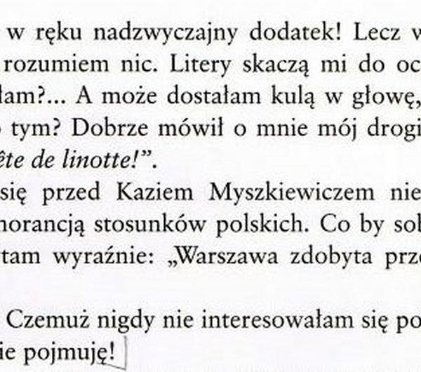 pory Kartek nie wznawiano. Aż w końcu na nowo ujrzały światło dzienne. I świetnie! Nareszcie! Brawo drogie wydawnictwo.Historia fikcyjna, niech nie zmyli nikogo „pamiętnikarski” tytuł. Za to już „kartki” należy brać dosłownie. Krótka to książeczka, ale jakże urocza. Samej treści jest niewiele, to raczej satyryczne opowiadanie, niż powieść, ale dodatkowo uzupełnione o zdjęcia z przewrotu majowego, fotografie autorki i kalendarium wypadków majowych 1926. I bardzo ładnie oprawione.Autorką (wymyśloną przez Samozwaniec) zapisków z wydarzeń majowych rozgrywających się na ulicach Warszawy w 1926 roku jest Mimi – neé Bączkowska, a po