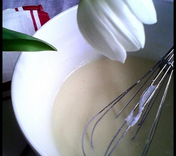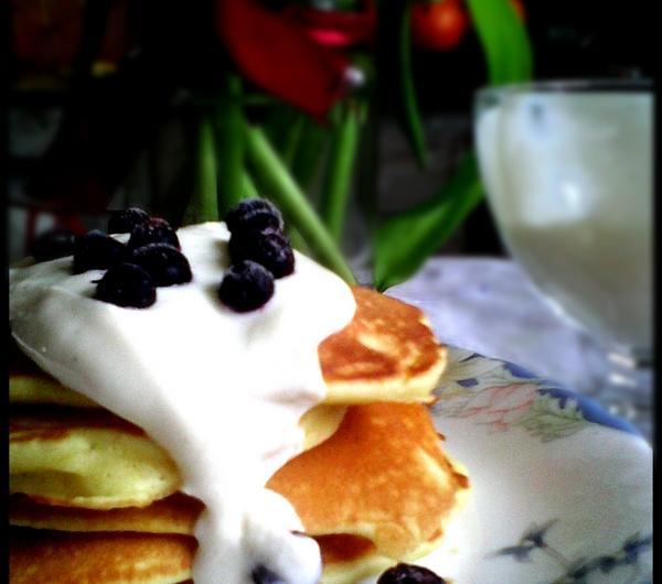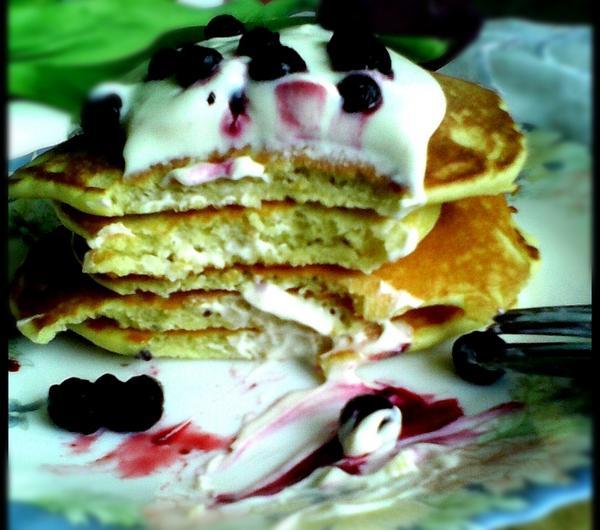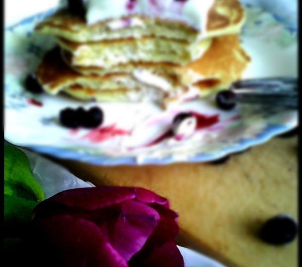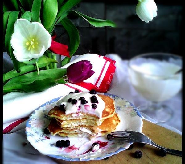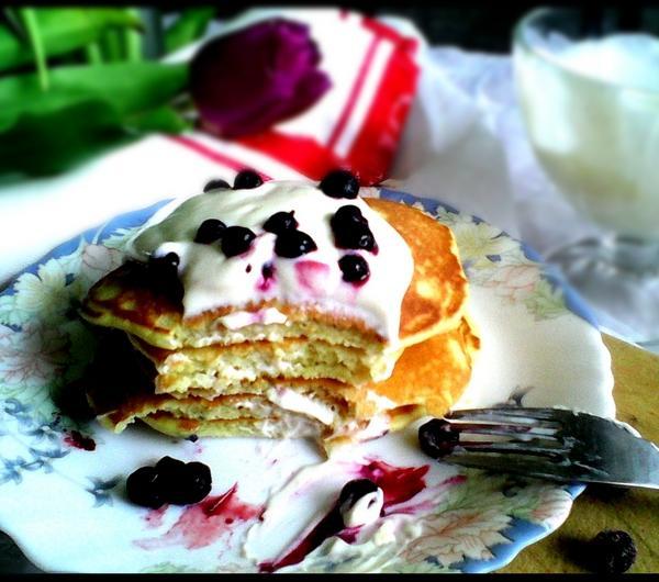Etapy przygotowania:1. Roztapiamy masło.2. Do miski przesiewamy mąkę, dodajemy mleko, proszek do pieczenia, cukier puder sól i żółtka (białka ubijamy na pianę w oddzielnym naczyniu i dodajemy pod koniec do reszty składników). Na końcu wlewamy roztopione masło.3. Ciasto smarzymy na suchej patelni teflonowej, bez dodatkowego tłuszczu, na średnim ogniu, tak aby dać ciastu szansę na wyrośnięcie. Formułujemy małe placuszki. Delikatnie przewracamy na drugą stronę, kiedy już się zarumienią.4. Upieczone pancakes układamy jeden na drugim, polewamy kremem i posypujemy owocami.