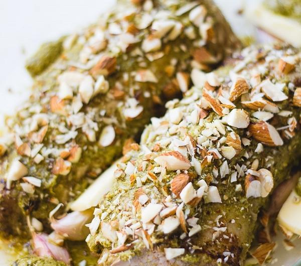 Polędwiczka wieprzowa z pesto i migdałamiAuthor: Miss BerryCzas przygotowania: 25 minutCzas gotowania: 40 minutW sumie: 1 godzina 5 minutPorcje: 3Składnikipolędwiczka wieprzowa (ok. 500 g)100 g zielonego pestogarść posiekanych migdałów3 ząbki czosnku2 łyżki masłaświeżo zmielony pieprz2 duże batatygarść zielonych szparagówPrzygotowaniePolędwiczkę wieprzową przekroić na dwie części, tak aby zmieściła się do naczynia żaroodpornego.Posypać świeżo zmielonym pieprzem i wysmarować zielonym pesto.Polędwiczkę podsmażyć na patelni na odrobinie tłuszczu, aby zamknąć pory mięsa.Włożyć do naczynia żaroodpornego i dodać lekko rozgniecione ząbki czosnku, masło, posypać posiekanymi migdałami. Do naczynia dodać pozostałą cześć zielonego pesto.Bataty przekroić na ćwiartki, ułożyć w osobnym naczyniu żaroodpornym, posypać solą i skropić oliwą z oliwek.Bataty i mięso piec w piekarniku rozgrzanym do 180 C przez około 30-40 minut.Podawać z ugotowanymi szparagami i polać sosem powstałym w naczyniu z mięsem.Smacznego!Wartości odżywczeRozmiar porcji: 470 g Kalorie: 490 kcal Tłuszcze: 20,8 g Węglowodany: 35,6 g Błonnik: 7,2 g Białko: 42,8 g3 . 2.2925