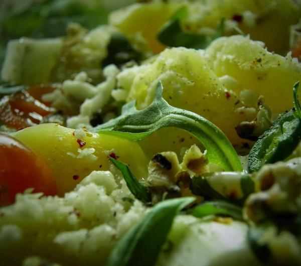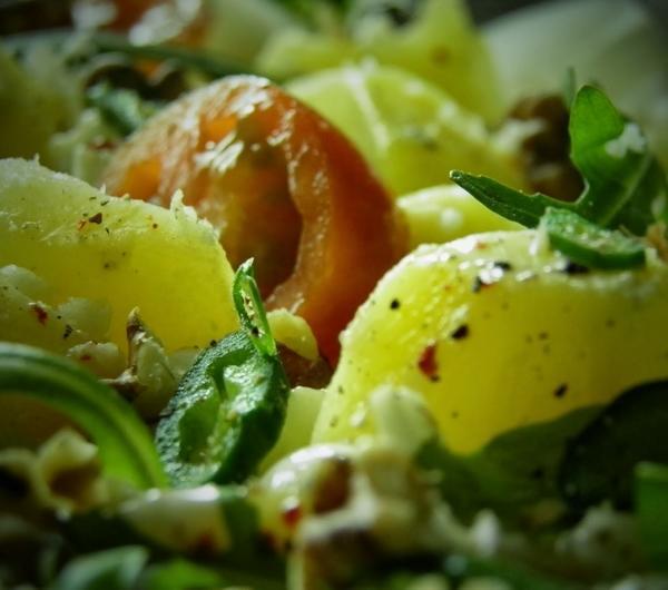 pomidorki, posypuję pokrojoną w bardzo cienkie plasterki papryczką, przyprószam resztą