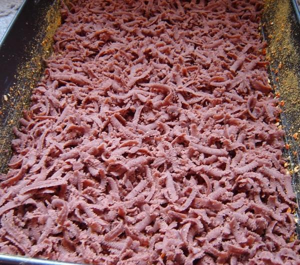 Wykonanie placka:Schłodzone ciasto podzielić na dwie części. Jedną część zetrzeć na blachę posmarowaną tłuszczem i posypaną wiórkami.