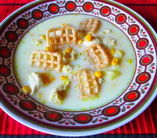 Nietypowe połączenie- ale jakie smaczne!Składniki:1 puszka kukurydzy5 szklanek bulionu drobiowego z kostki1 szklanka śmietanki1 filet drobiowysól do smakupieprz do smakusnack do smażeniaWykonanie:Kukurydzę zmiksować, dodać do bulionu z pokrojonym w kostkę filetem z kurczaka i gotować około 25 minut. Następnie wlać śmietankę przyprawić do smaku i podawać z usmażonymi według opisu na opakowaniu „przysmakiem snack” (okienka) lub grzankami.