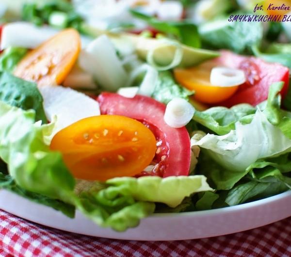 Warzywa kroimy w kostkę lub plastry jak wolicie, układamy na sałacie. Polewamy sosem.SOS DO
