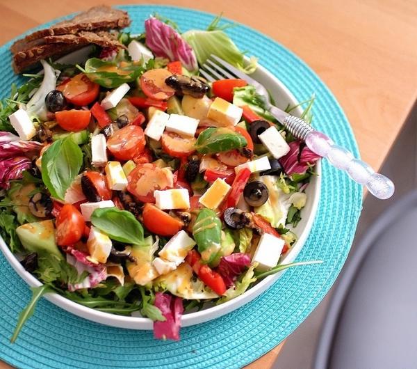 Dietetyczna, pyszna sałatka z bogactwem witamin!SKŁADNIKI:- mix sałat ulubionych- pomidorki koktajlowe- fit feta- oliwki czarne kilak sztuk- świeża bazylia- papryka czerwona- ogórek zielony- różowym marynowany imbir- kromka chleba na zakwasie pełnoziarnistegoSOS RÓŻOWY DO SAŁATKI:- 3 łyżki jogurtu naturalnego (ja używam marki Zott)- 1 łyżka ketchupu (ja używam Pudliszki)- 1 łyżeczka miodu- 1 łyżeczka octu winnego- sólWszystko bardzo dokładnie wymieszaj, dolej ewentualnie 1 do 3 łyżek wody. Taka ilość na co najmniej 2 sałatki.Dzień dobry!Aktywnego Dnia!Buziak!