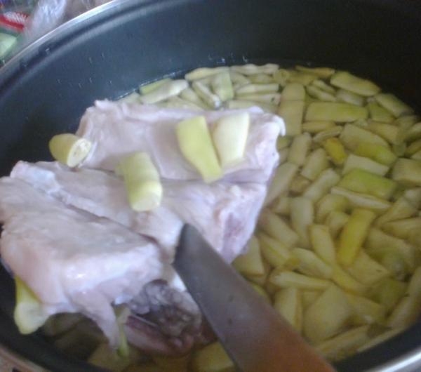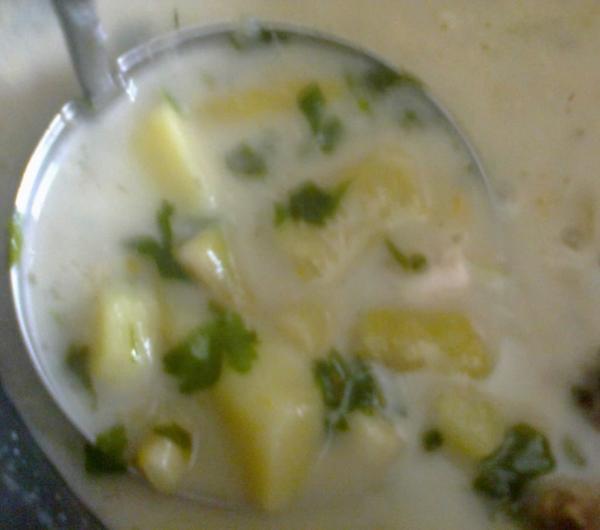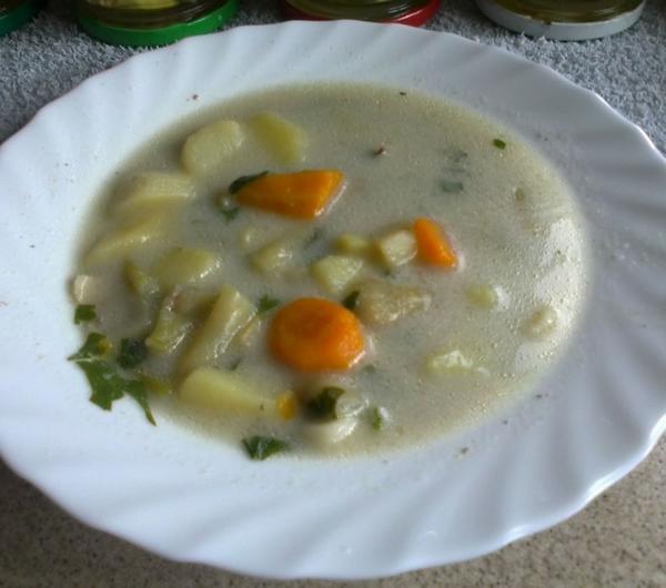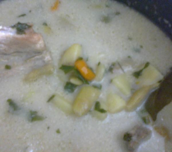 Składniki:0,5kg fasolki szparagowej,2 kostki od schabu,2 marchewki,1 duży korzeń pietruszki,kawałek selera,por,1kg ziemniaków,śmietana 30%,łyżka pokrojonej natki pietruszki,sól, pieprz, magii, 3 liście laurowe, 4 ziarna ziela angielskiego.Przygotowanie:Ugotować wywar z kości i warzyw (oprócz natki pietruszki i ziemniaków), od razu dodając fasolkę - fasolkę pokroić na 3 części. Do wywaru dodać 3 liście laurowe, 4 ziarna ziela angielskiego, sól, pieprz i można dodać ciut magii. Ziemniaki obrać, umyć, pokroić w kostkę lub na mniejsze części i dodać do wywaru po 30minutach. Łącznie gotować ok.1h, do momentu aż wszystkie warzywa będą miękkie. Na koniec dodać śmietanę i zieloną pietruszkę.