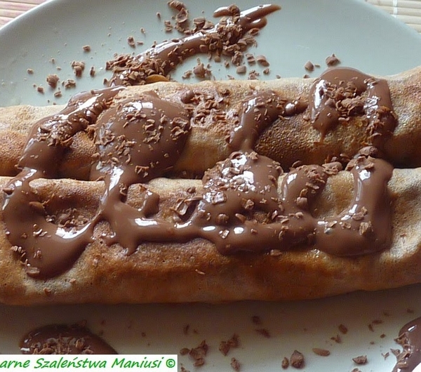 Zapraszam was na dzisiaj na pyszny obiad, moje ulubione naleśniki. Tym razem przygotowałam je z wykorzystaniem produktów firmy Alpro . Zamiast mleka użyłam napój sojowy czekoladowy i zamiast jogurtu do farszu deserek czekoladowy sojowy. Naleśniki wyszły pyszne, delikatne i chrupiące na końcach.Coraz bardziej mi smakują ich produkty, napoje sojowe używam teraz także do kawy zamiast mleka a mój Junior pije szklaneczkę do śniadania lub na deser. Desery sojowe sprawdziły się także jako dodatek do musli, owsianki i płatków na śniadanie.Zapraszam do spróbowania :-)Składniki:- 2 jajka- 320 ml mleka sojowego czekoladowego Alpro- 140 g mąki pszennej- 250 g twarogu półtłustego- 2 deserki czekoladowe Alpro- 2 łyżeczki cukru- pół łyżeczki cukru waniliowego- czekolada mleczna starta do posypaniaWykonanie:Do naczynia miksującego wbijamy jajka, wlewamy mleko i wsypujemy mąkę, miksujemy. Ja zmiksowałam w Thermomix - czas 20 sek, obr.5.Na patelni posmarowanej lekko olejem smażymy naleśniki, z podanych porcji wyszło mi 6 sztuk.Twarożek mieszamy w misce z jednym deserkiem czekoladowym, cukrem, cukrem waniliowym i nakładamy na naleśniki, zwijamy, układamy na talerze i polewamy drugim deserem czekoladowym, posypujemy startą czekoladą.Smacznego :-)