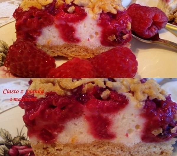 SKŁADNIKICiasto:2,5 szklanki mąki pszennej1 kostka margaryny2 łyżeczki proszku do pieczenia4 łyżki cukru pudru5 żółtekMasa piankowa:7 białek1 szklanka cukru3 opakowania budyniu waniliowego lub śmietankowego, bez cukru3/4 szklanki oleju rzepakowegoOwoce :1 kg. malinWYKONANIECiasto zagniatamy w misce lub na stolnicy. Mieszamy mąkę z proszkiem i cukrem dodajemy startą na tarce zimną margarynę. Rozcieramy szybko z mąką, dodajemy żółtka i zagniatamy ciasto.Dzielmy na dwie części 3/4 i 1/4. Zawijamy w folię i większą część wstawiamy do lodówki na ok. 1 godz., a drugie do zamrażarki.Piekarnik rozgrzewamy do 180 stopni. Blaszkę 33x 23 wykładamy papierem do pieczenia. Na spód wykładamy większą część ciasta z lodówki i zapiekamy spód ok 20 min. Odstawiamy do wystudzenia.Masa budyniowaBiałka ubijamy na sztywną pianę. Następnie powoli dosypujemy cukier. Następnie, również powoli i stopniowo, dodajemy proszek budyniowy. Na koniec, cienką strużką wlewamy olej - ciągle miksując aż pianka będzie idealnie gładka.