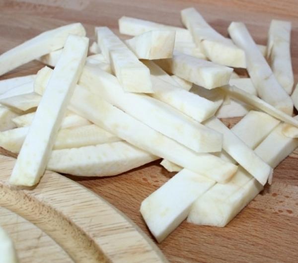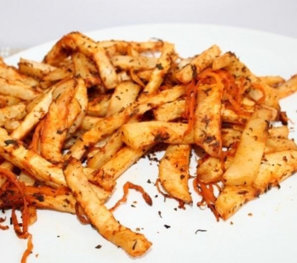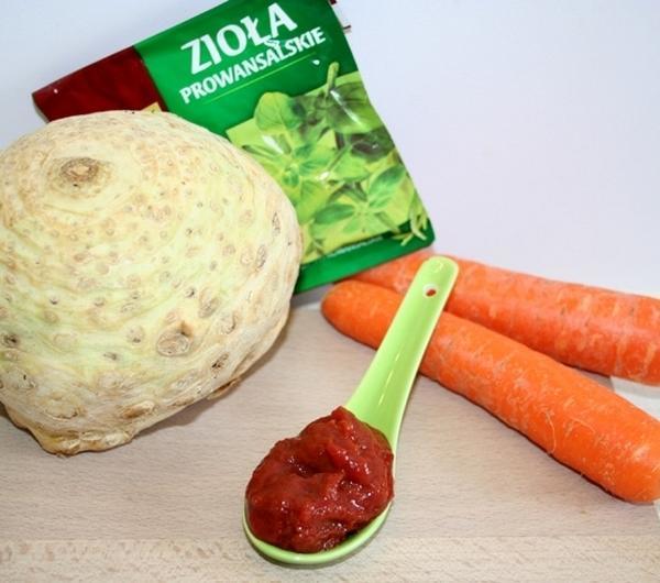 Składniki:Korzeń seleraKoncentrat pomidorowyPapryka słodkaChilliZioła prowansalskieCząberPieprz ziołowyOliwaMarchew (opcjonalnie)Sposób przygotowania:Korzeń selera obieramy, myjemy i kroimy w paski jednakowej grubości. Surowe frytki z selera przyprawiłam ok. 2 łyżkami koncentratu pomidorowego, ziołami prowansalskimi, szczyptą chilli, cząbrem, pieprzem ziołowym.
