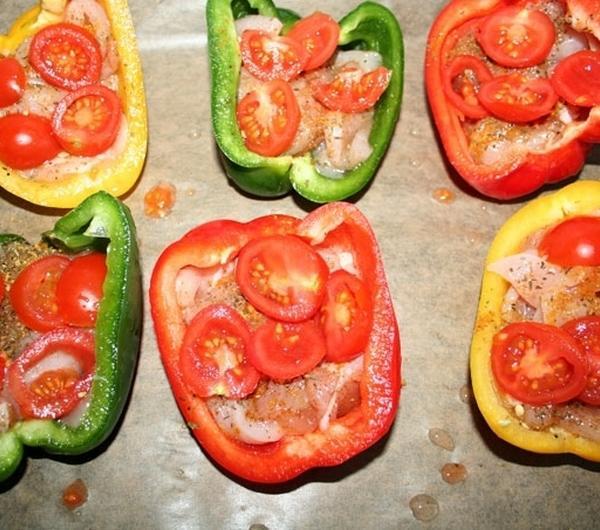 Pod koniec pieczenia kładę na każda połówkę papryki plasterek mozzarelli, pozostawiam do roztopienia i w zasadzie nasza papryka faszerowana gotowa.